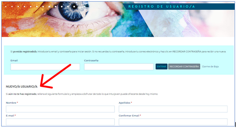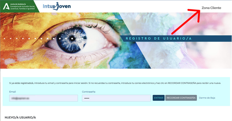 Si no sabes si estás registrado/a en nuestro portal web, haz clic arriba en Zona Cliente o en el siguiente enlace https://www.inturjoven.com/registro, escribe tu email y haz clic en RECORDAR CONTRASEÑA. El sistema te responderá enviándote una nueva contraseña a tu correo electrónico si ya estás registrado/a o te mostrará un mensaje indicándote que no se ha encontrado el usuario/a, por lo que tendrás que registrarte desde esa misma página web, rellenando los datos del formulario que aparece más abajo y haciendo clic en ENVIAR.