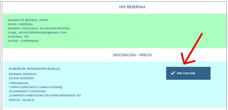 5. En el detalle de la reserva haz clic en el PRE-CHECKIN que vas a realizar: